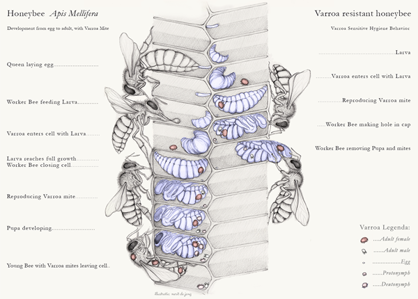 Mai jos aveti o reprezentare a doua categorii de albine: in partea stanga se poate observa un ciclu de dezvoltare al albinei si Varrozei intr-o forma clasica. In partea dreapta este reprezentata capacitatea unor albine care intrerup ciclul reproductiv al Varrozei in stadiul de nimfa al albinei .Nimfa infestata este identificata,decopertata,scoasa afara si devorata.